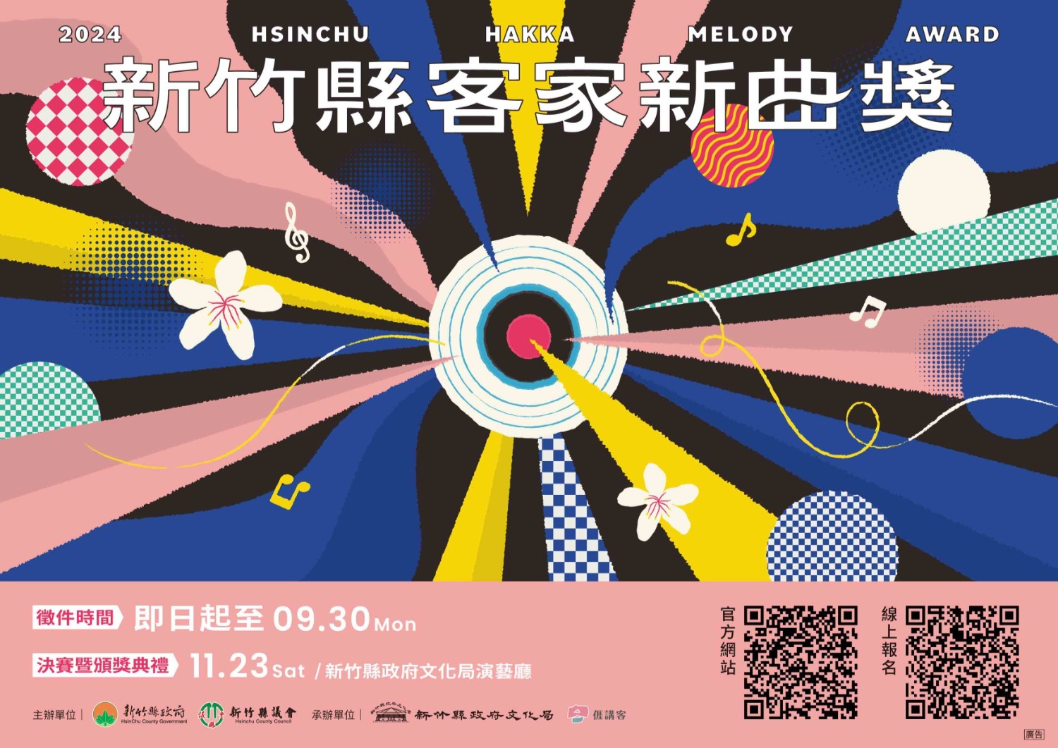 2024 新竹縣客家新曲獎 為鼓勵並發掘創作人才,創作貼近當代生活的客語音樂,新竹縣政府文化局特辦理「2024新竹縣客家新曲獎」提升社會大眾對客語音樂聆賞的興趣,進而發揚客家文化。 主辦單位:新竹縣政府、新竹縣議會 承辦單位:新竹縣政府文化局